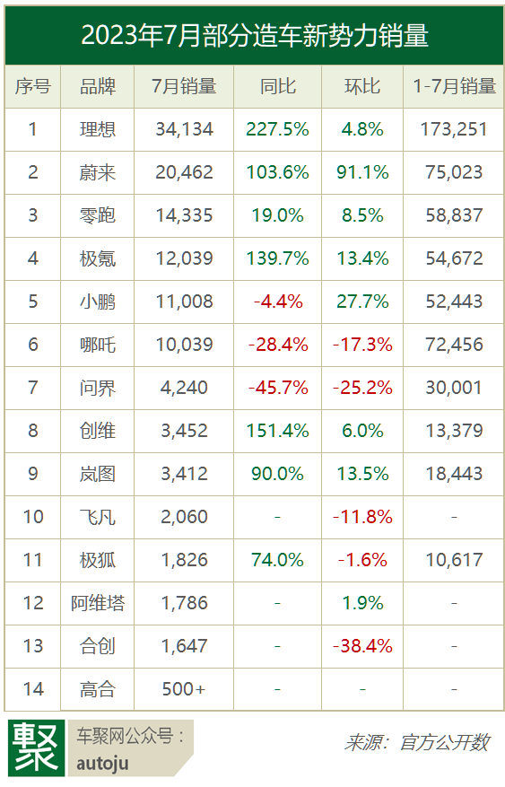 问界、创维和岚图销量在3000-5000辆之间。其中,问界7月交付4,240辆,同比下降45.7%,环比下降25.2%,与去年出彩的表现相比,似乎高光不在。不过,据悉,被余承东称作1000万以内最好的SUV——问界M9将于今年第四季度上市,不知道届时M9的到来能否对问界的销量起到改善作用呢?