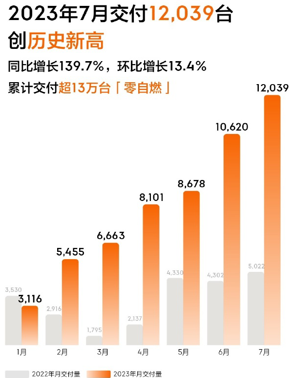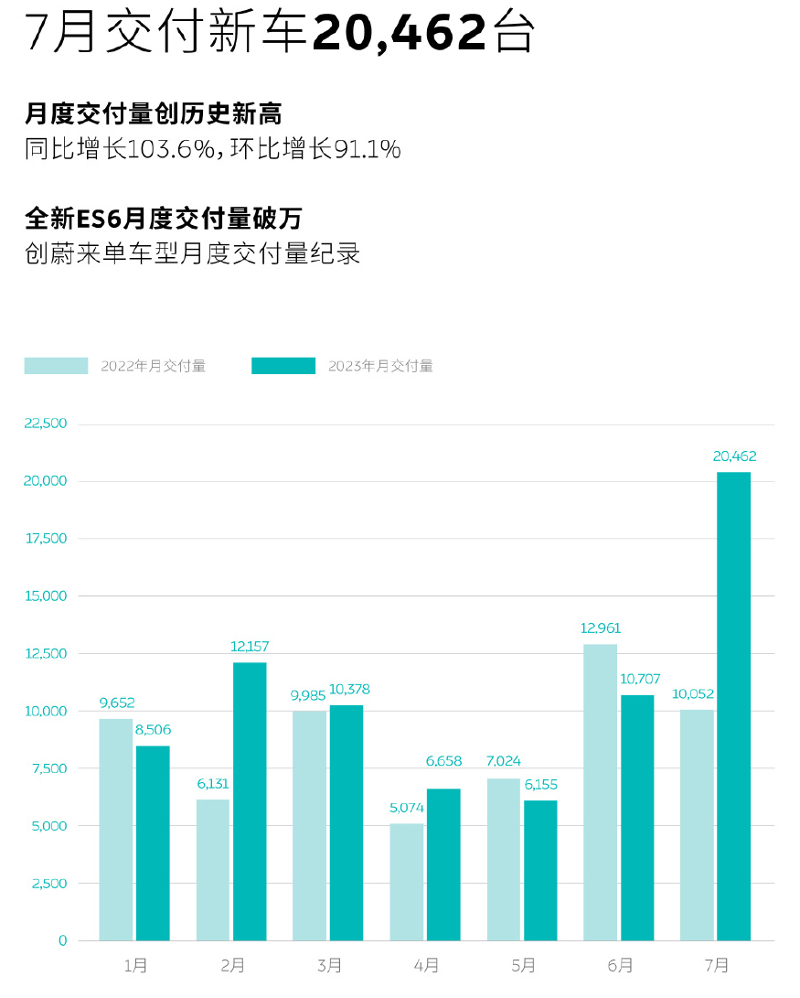 蔚来7月交付2.05万辆,同比增长103.6%,环比增长91.1%,创其月交付历史新高,同时首次月销突破2万辆。其中,全新ES6交付破万辆,也创蔚来单车型月度交付量纪录。2023年1-7月,蔚来累计交付7.5万辆,自交付以来共交付36.46万辆。