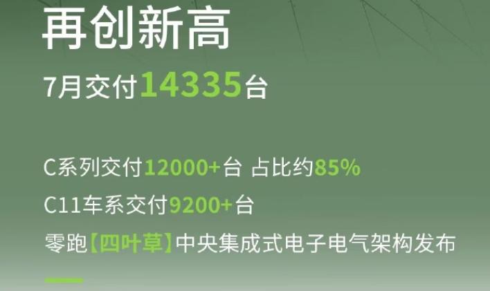 7月,零跑交付的新车中,C系列交付超1.2万辆,占比约85%。其中C11车系交付量超9200辆,这意味着零跑已扭转了对微型车的依赖,品牌向上成果显著。