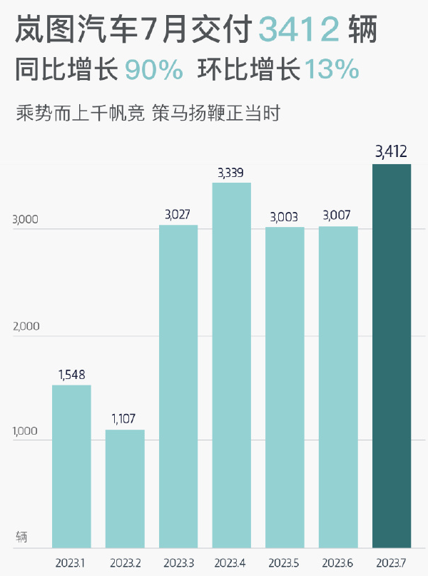 岚图7月交付3,412辆,同比增长90%,环比增长13.5%,连续五个月销量超3,000辆;1-7月累计交付1.84万辆。据悉,岚图与百度合作打造的新款岚图FREE将在8月正式上市,不知道届时岚图能否突破自我,销量取得进一步提升?