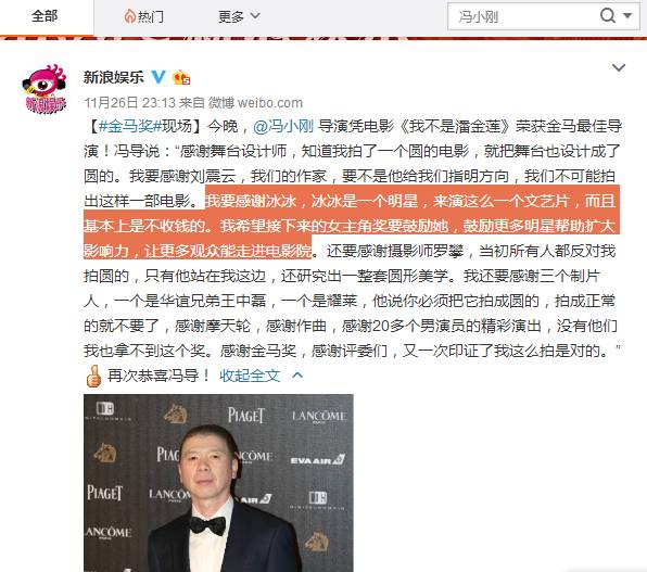 上个周末,电影金马奖的颁奖典礼在台湾举行,凭借电影《我不是潘金莲》入围最佳女主角的范冰冰,在一些人看来有些意外的在这一奖项的最终竞争中,输给了两位年轻的“小花旦”周冬雨和马思纯。但是这还不是我们今天讨论的重点,今天要说的重点是冯小刚在本届金马奖上获得了最佳导演,他在说自己的获奖感言时说:“我要感谢冰冰,冰冰是一个明星,来演这么一个文艺片,而且基本上是不收钱的。我希望接下来的女主角奖要鼓励她,鼓励更多明星帮助扩大影响力,让更多观众能走进电影院。”