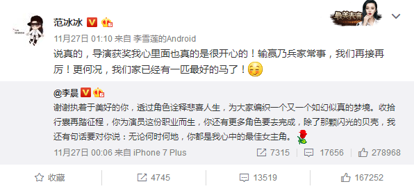 范冰冰从来不会掩饰自己的野心,这也是她被称作“范爷”的重要原因之一。在这次错失金马奖后,她转发了她男友李晨的微博。在转发中说“输赢乃兵家常事,我们再接再厉!”,从这可以看出,在她内心的深处还是十分想获得这个奖。