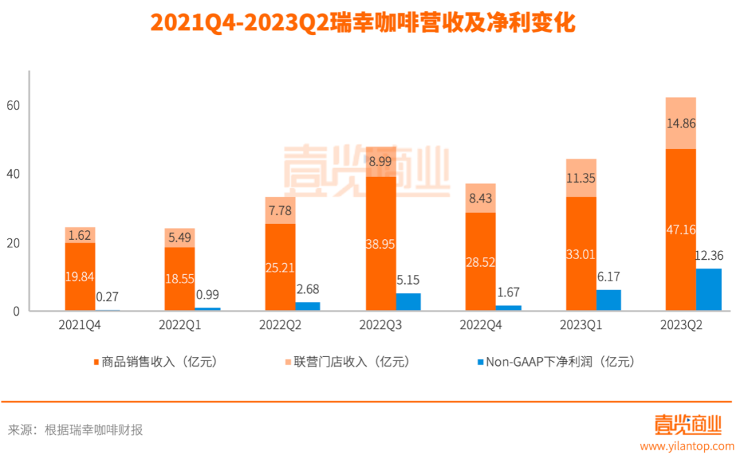 瑞幸咖啡第二季度62.01亿元的营收构成中:来自商品销售的营收为47.16亿元(其中现制饮品营收为42.35亿元),同比增长87.0%;来自联营门店的营收为14.86亿元,同比增长91.1%。非美国通用会计准则(non-GAAP)下净利润为12.36亿元,同比大涨260.82%。