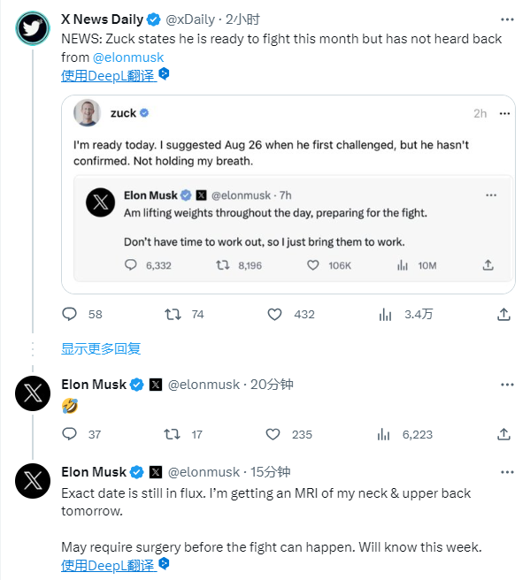 8月7日,马斯克在社交平台上回复与扎克伯格格斗一事表示,具体日期还在确定中,马斯克称明天要做头颈和上背部的核磁共振检查,可能需要在格斗前做手术,本周就会知道结果。
