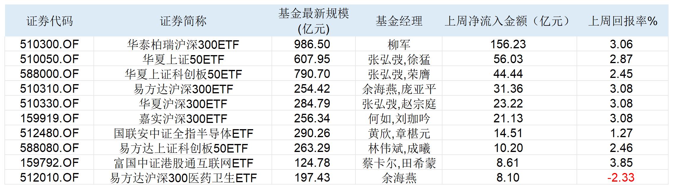 在上周净流入金额前十位的ETF名单中,多只沪深300ETF霸榜。其中,华泰柏瑞沪深300ETF上周净流入金额156.23亿元,位居市场第一位。截至8月4日收盘,该ETF的最新规模为986.5亿元,成为全市场规模最大的ETF,距离千亿规模仅一步之遥。该ETF上周回报率为3.06%。易方达沪深300ETF、华夏沪深300ETF在上周也分别净流入31.36亿元、23.22亿元,最新规模为284.79亿元、256.34亿元,上周回报率均为3.08%。