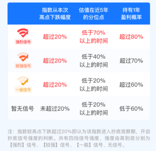 当指数较前期高点下跌超20%即认为该指数进入抄底观察期;估值在近5年的分位点低于20%、40%、70%以上的时间,持有1年盈利概率高于60%、70%、80%的指数分别归为一般、较强、强烈信号;当不满足以上条件时,归为无信号。