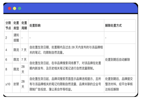 2022年4月20日,小红书正式上线品牌违规分,对品牌在社区内的营销行为进行持续监控,不断推进对虚假种草品牌的打击,记录此类品牌违规营销分;若记分达到相应值将触发警告、全域限流、封禁搜索和商业化投放等处罚。