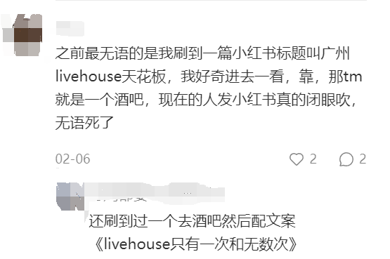 此外,Livehouse在本身的发展过程中,也出现了不少问题,影响了自身的口碑。因为Livehouse的收入和重心应该是以音乐演出为主、酒水为辅,但不少场地却通过设置VIP卡座、推销酒水来营收,忽略音乐演出本身,导致了Livehouse的污名化。剁主搜索发现一家名为“ZH live音乐现场”的livehouse,有各类酒水套餐,但完全没有演出相关的消息,而类似的案例还有很多。有网友表示,“很多就是打着Livehouse的名头吸引眼球,但实际上就是酒吧。”