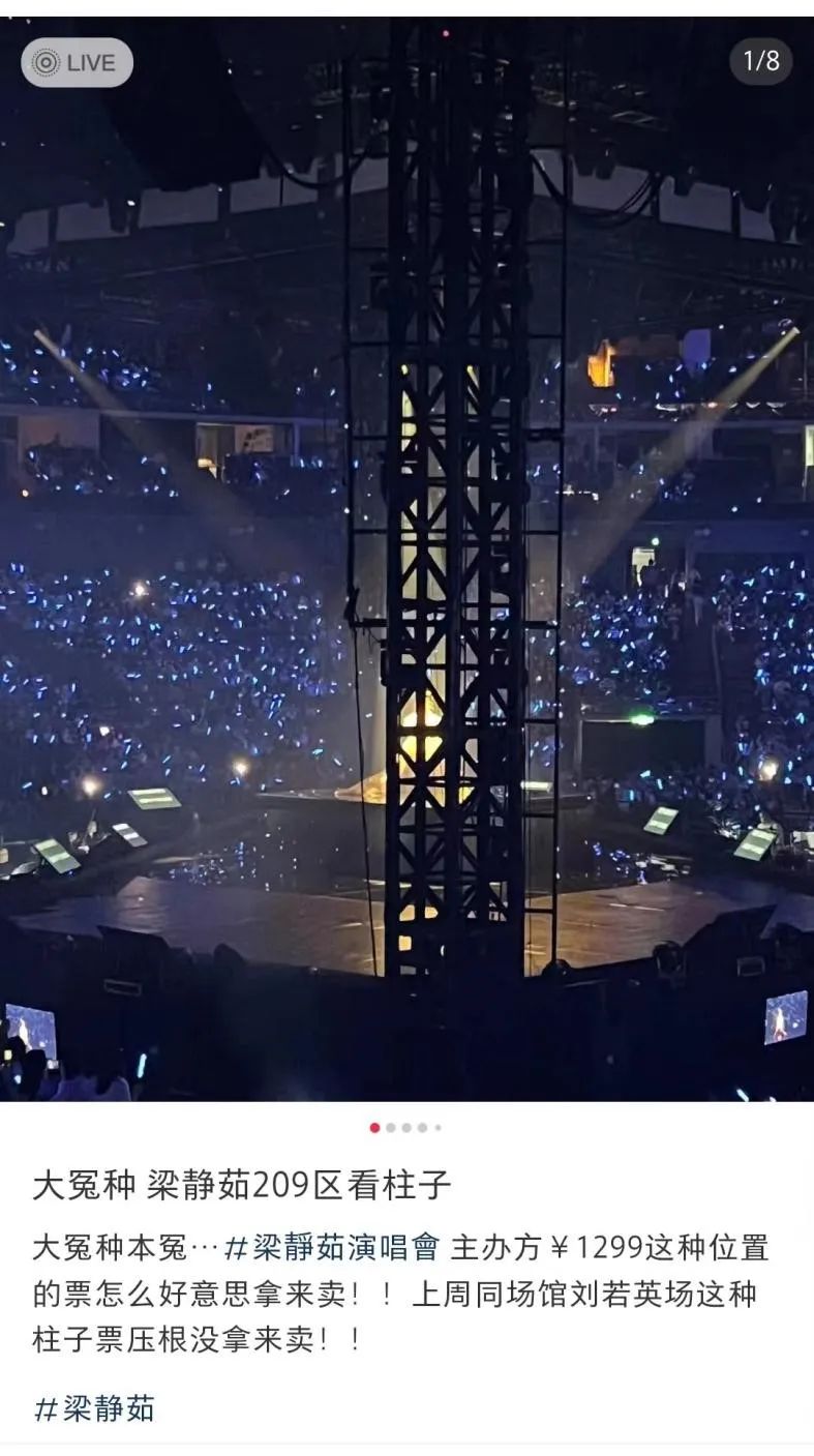 今年频繁出现的“柱子票”更是直接损害了观众的正常消费权益。在今年5月梁静茹上海场的演出会中,就有粉丝不幸花千元买到“柱子票”并且维权无门的现象。此外,包括刘若英、毛不易在内的多位歌手的演唱会,都出现了“柱子票”。