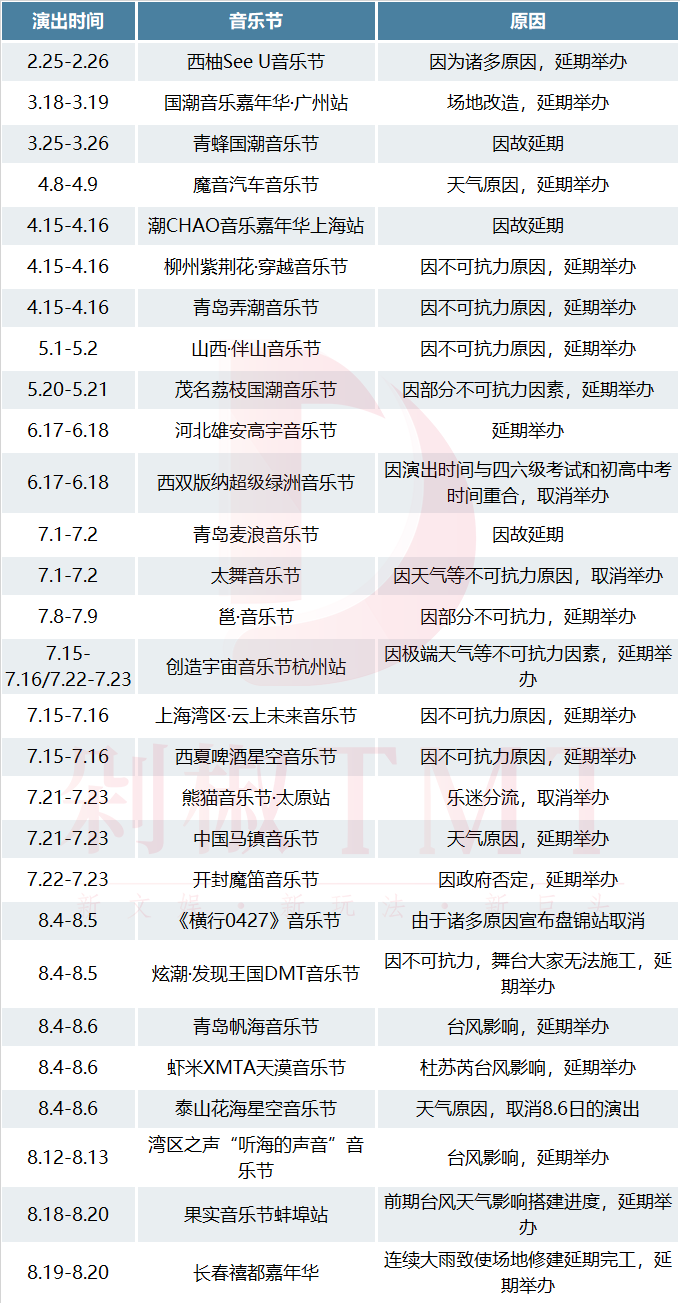 其实从上半年开始,就已经有部分音乐节宣布取消或延期。而近期,发布停演公告的音乐节越来越多。据不完全统计,截至8月5日,已经发布延期或取消公告的音乐节近30场。光是7月,停演的音乐节就多达10场。