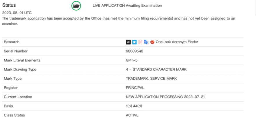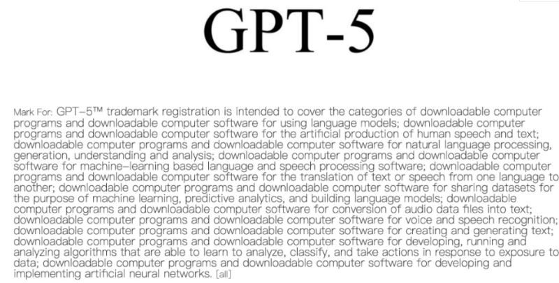 而最近,美国专利商标局 (USPTO) 披露的一份文件显示:OpenAI于7月18日提交了「GPT-5」的商标申请。并且已经被接收。