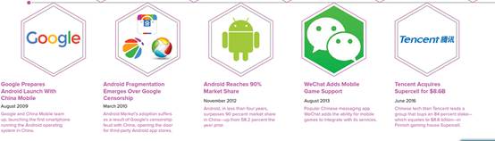 从iPhone手机2009年在中国发售,到2013年微信支持用户下载游戏,再到腾讯于2016年收购Supercell的多数股份,中国移动游戏市场在过去几年见证了闪电般的快速发展。下图展示了中国移动游戏市场在发展过程中的几次里程碑事件。