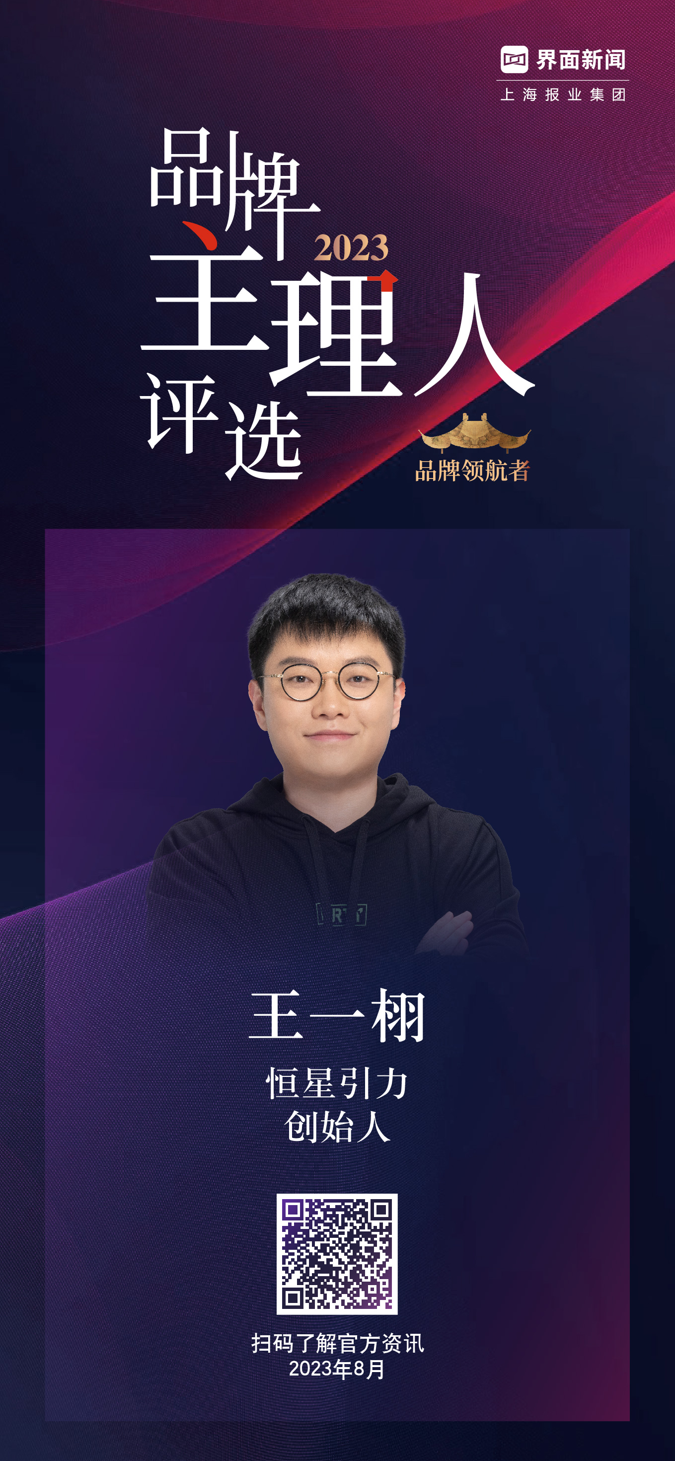 恒星引力创始人王一栩先生带领公司以 IP开发为源头,深度布局全产业链,打造优质娱乐内容,用作品弘扬青春阳光正能量,从而荣获2023年度品牌主理人荣誉宝座。