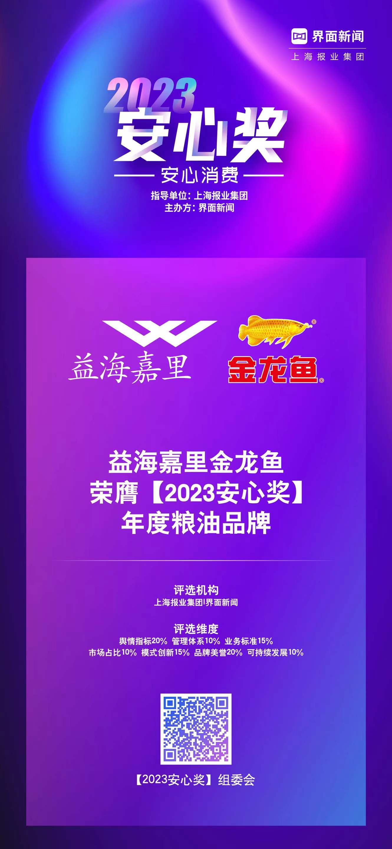 益海嘉里金龙鱼始终秉承营养、健康、安全的研发理念,成为粮油业的质量领跑者、创新探索者和发展示范者,当之无愧荣获【2023安心奖】年度粮油品牌。