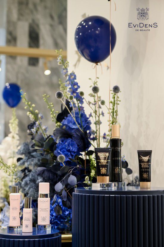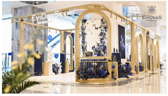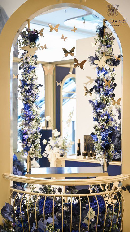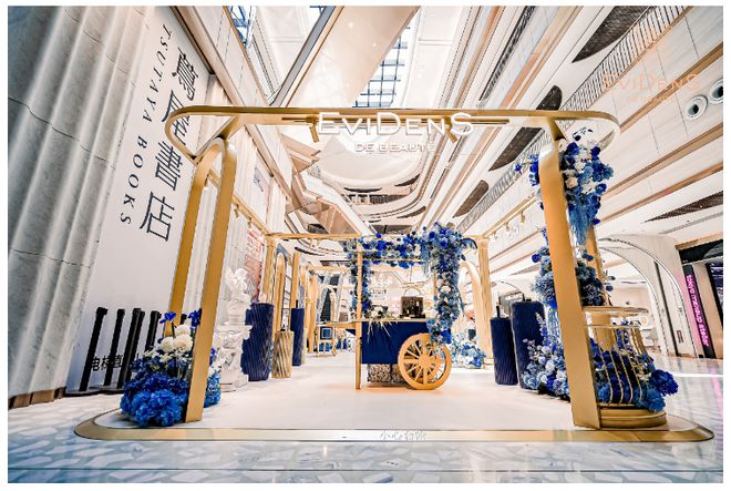 格拉斯高定香氛是EviDens de Beauté伊菲丹的独特品牌基因之一,亦为此次快闪店的装饰灵感源泉。品牌每款系列香氛均来自世界香水之都格拉斯,由法式调香师采用精湛的古法技艺调配而成,力图让每一系列产品的独家香氛均能使护肤成为一场高定香氛的愉悦体验。EviDens de Beauté伊菲丹的明星系列臻美线产品即是玫瑰、格拉斯茉莉与晚香玉融合后的精致芬芳,是根植在查尔斯记忆中的独特嗅觉韵律。EviDens de Beauté伊菲丹蒙福特城堡花园快闪店以品牌墨水蓝为主色调,以格拉斯花卉为表现形式,遵循法式建筑的特色,讲究用花卉点缀在建筑中,追求色彩和内在联系,有意呈现典雅建筑与烂漫环境的冲突之美。