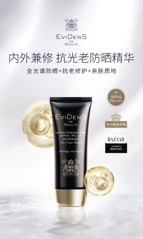 EviDens de Beauté伊菲丹精华防晒: EviDens de Beauté伊菲丹精华防晒是一款专为敏感肌肤设计的产品。它集防晒、精华、妆前乳和隔离的功能于一身,为肌肤提供全面的防护和修护。能够使肌肤保持健康和年轻的状态。其调配配方特地结合了高效的防晒成分和修护抗老成分。该产品具有高倍防晒指数SPF50 PA++++,持续抵御紫外线的伤害,预防日晒引起的皮肤问题,如晒黑、晒斑、晒伤和皮肤老化。同时,EviDens de Beauté伊菲丹精华防晒还含有四种抗老修护精华成分,具有抗氧化、保湿和修复肌肤的功效。这款精华防晒产品采用先进的技术和经过严格测试。