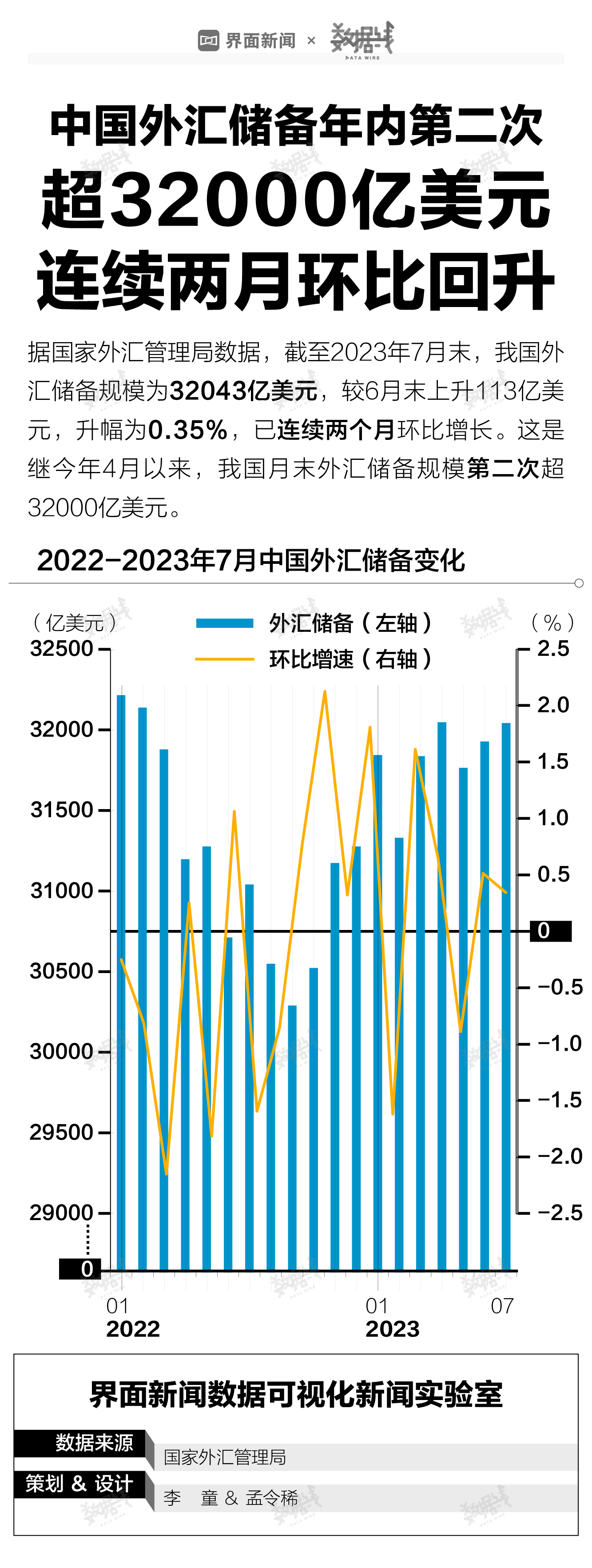 数据 | 中国外汇储备年内第二次超32000亿美元,连续两月环比回升