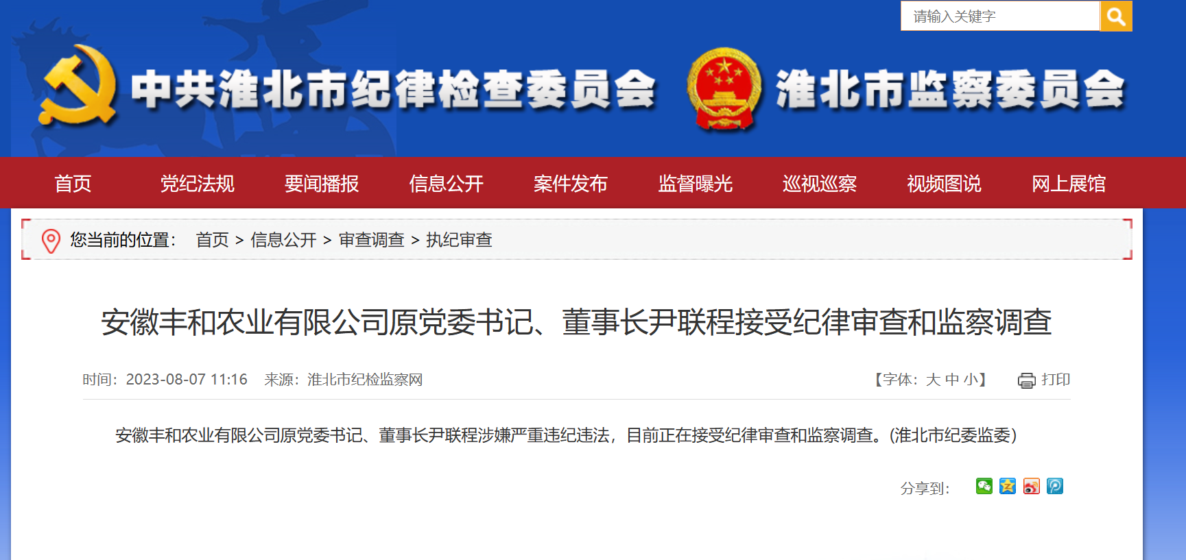 据淮北市纪检监察网显示,安徽丰和农业有限公司原党委书记、董事长尹联程涉嫌严重违纪违法,目前正在接受纪律审查和监察调查。(淮北市纪委监委)