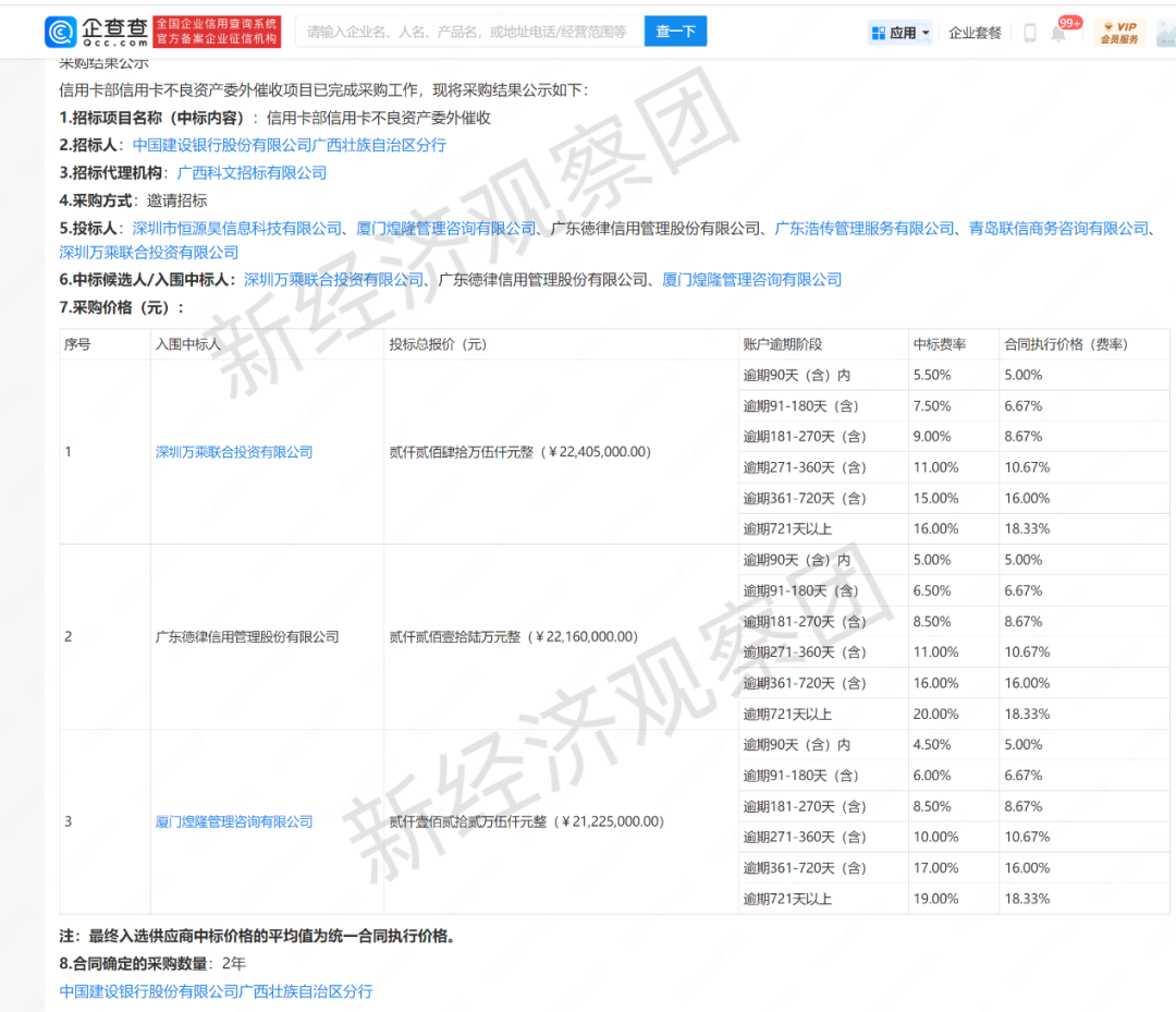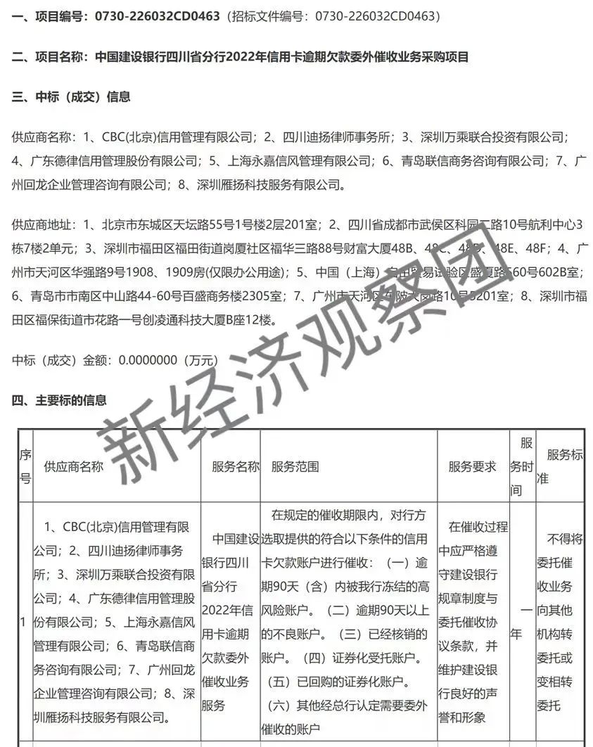 其中,2022年7月13日,中国建设银行四川省分行(以下简称“建行四川分行”)公布了《中国建设银行四川省分行2022年信用卡逾期欠款委外催收业务采购项目中标公告》(以下简称《建行公告》)。