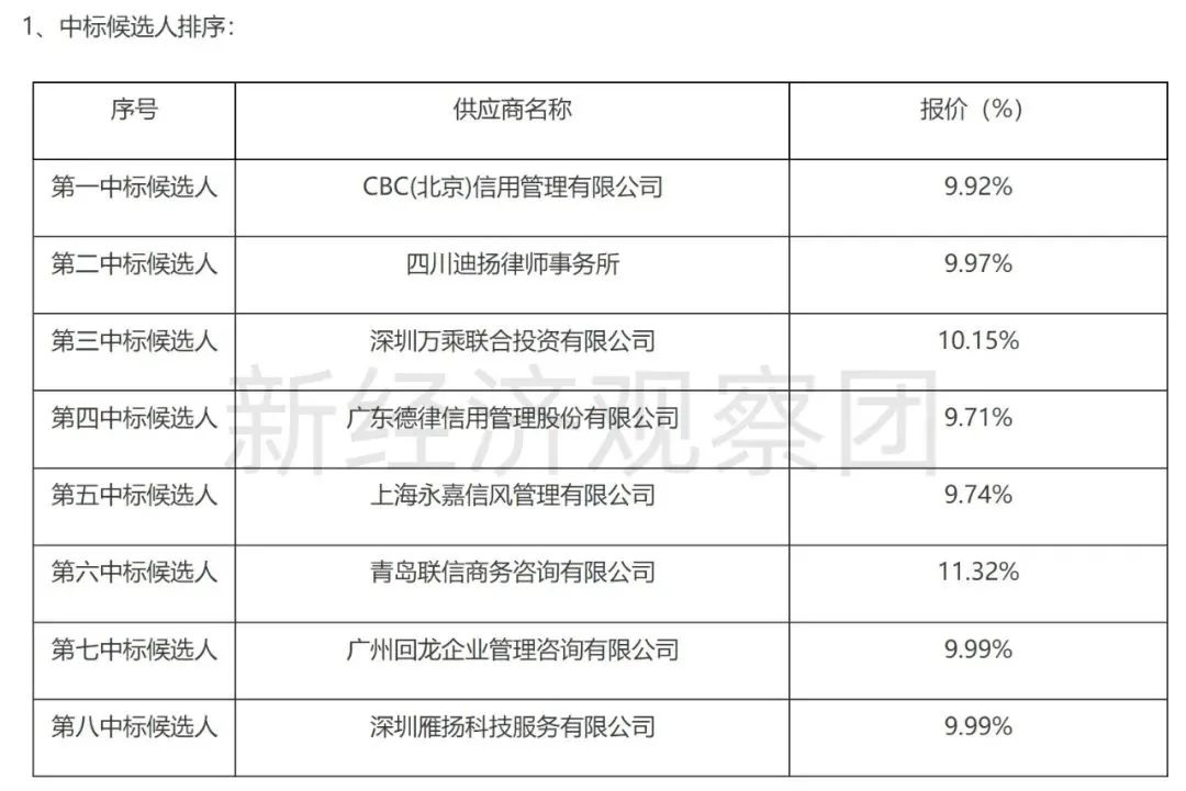 《建行公告》显示,共有8家供应商中标,即CBC、四川迪扬律师事务所、万乘联合、广东德律信用管理股份有限公司(以下简称“德律信用”)、上海永嘉信风管理有限公司、为青岛联信商务咨询有限公司(以下简称“青岛联信”)、广州回龙企业管理咨询有限公司、深圳雁扬科技服务有限公司。