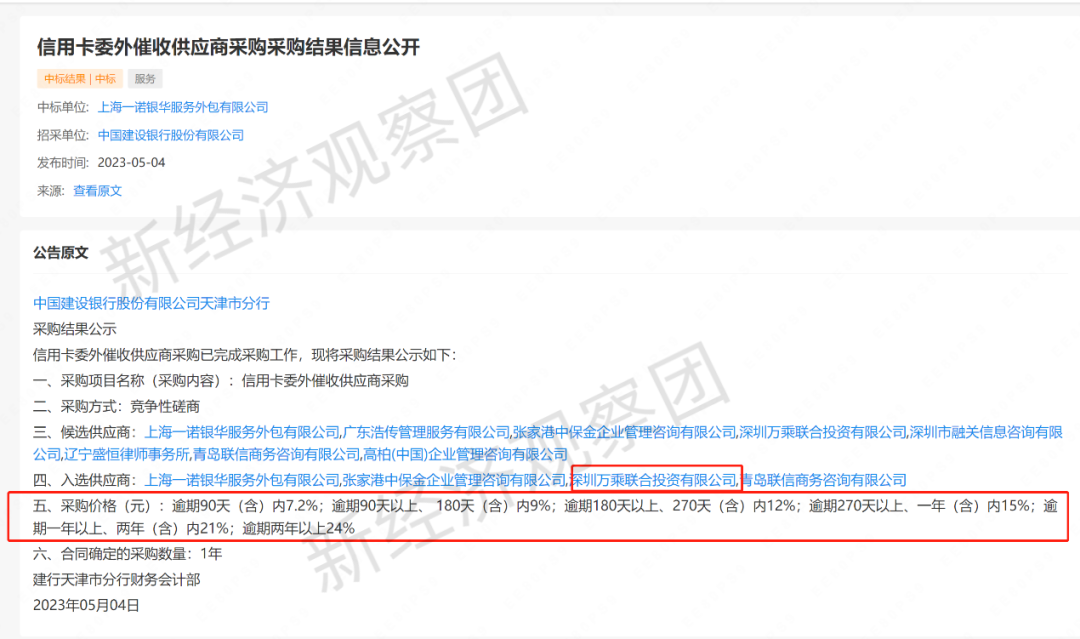 而在建设银行天津分行今年5月份公布的《信用卡委外催收供应商采购采购结果信息公开》中,入选的供应商有一诺银华、张家港中保金企业管理咨询有限公司、万乘联合、青岛联信等4家。