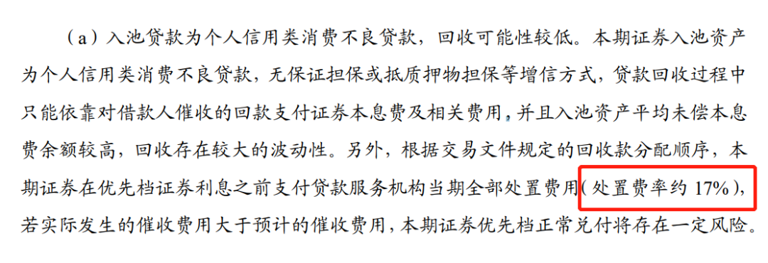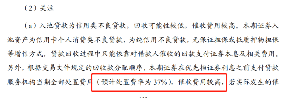 在项目说明书中,中信银行表示,该项目入池贷款为信用类不良贷款,回收可能性较低,催收费用较高,本期证券在优先档证券利息之前支付贷款服务机构当期全部处置费用(预计处置费率为37%),催收费用较高,若实际发生的催收费用大于预计的催收费用,本期证券优先档正常兑付将存在一定风险。