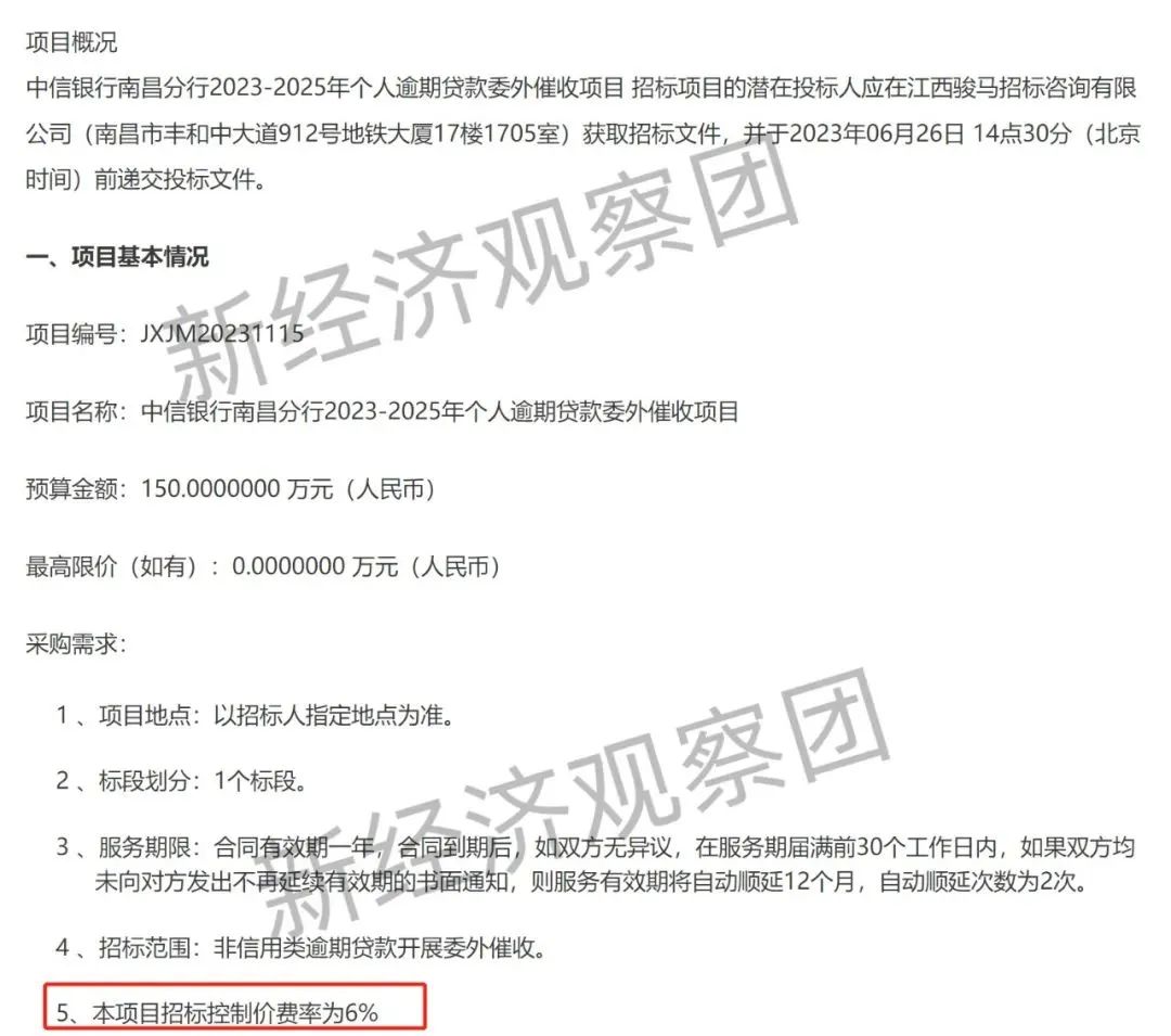 此外,6月14日,中信银行南昌分行公布的《中信银行南昌分行2023-2025年个人逾期贷款委外催收项目公开招标公告》内,该行要求招标控制价费率为6%。即供应商报价不得超过该费率,否则会超过招标人支付能力。