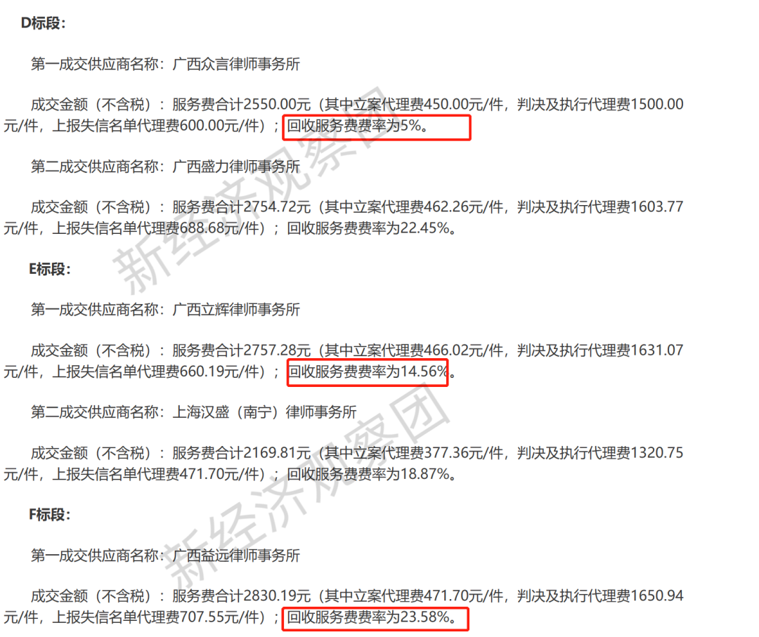 其中,广西众言律师事务所 成交金额(不含税):服务费合计2550.00元(其中立案代理费450.00元/件,判决及执行代理费1500.00元/件,上报失信名单代理费600.00元/件);回收服务费费率为5%;