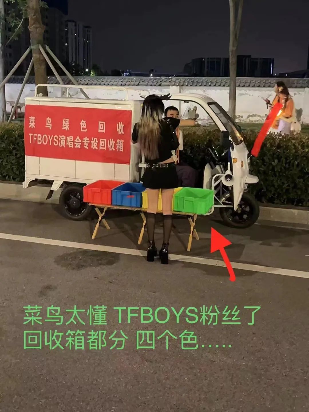 以上两个极端都是尽可能的选用正规媒体报道,经过“柔和脱敏”的叙述。在一些自媒体以及微博图文、视频信息里呈现的情景远比上述描绘“惊”彩。比如一个广泛流传的图片:菜鸟是懂TFBOYS的,连回收箱都分四个颜色。(蓝色、绿色和红色,分别是王俊凯、王源和易烊千玺“唯粉”们的应援色)