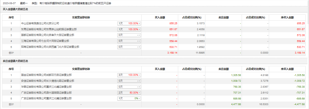 具体来看,国金证券成都双元街证券营业部、安信证券长沙潇湘北路证券营业部分别卖出1305.58万元、1009.72万元;中山证券北京分公司、东莞证券东莞茶山站前路证券营业部分别买入855.25万元、651.67万元。