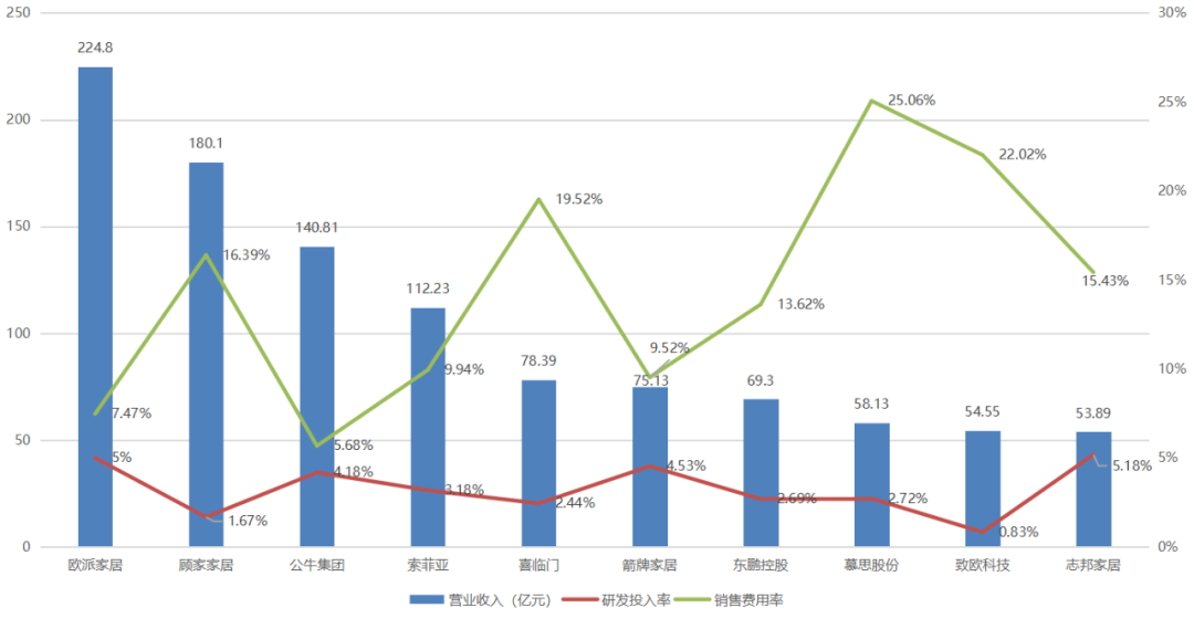 A股家居用品营收十强公司的研发投入率、销售费用率情况