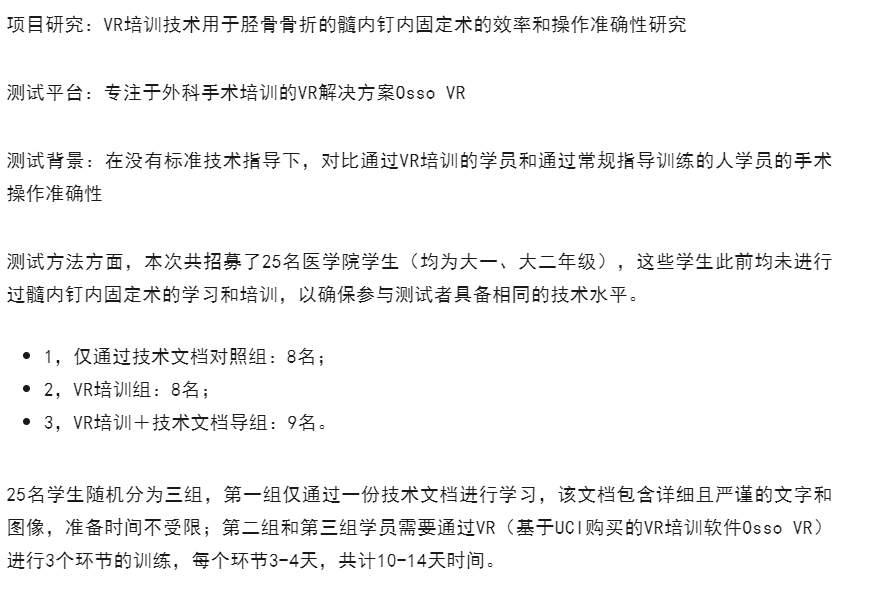 以外科手术为例,为探究“VR培训真的能提升手术熟练程度吗,比传统教学方式到底有多大优势?”等问题,芝加哥伊利诺伊大学医学院(UIC)决定展开一项“VR培训技术用于胫骨骨折的髓内钉内固定术的效率和操作准确性研究”测试。