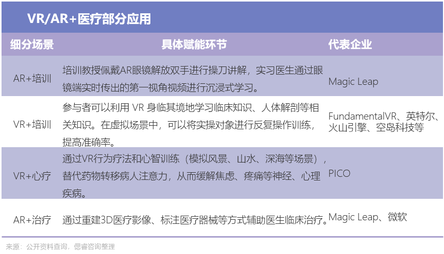 厚积而薄发。实际上,在医疗领域已有垂类厂商深耕多年,C端厂商大多有所布局。目前相结合的方式主要是VR/AR+医疗培训、治疗等。