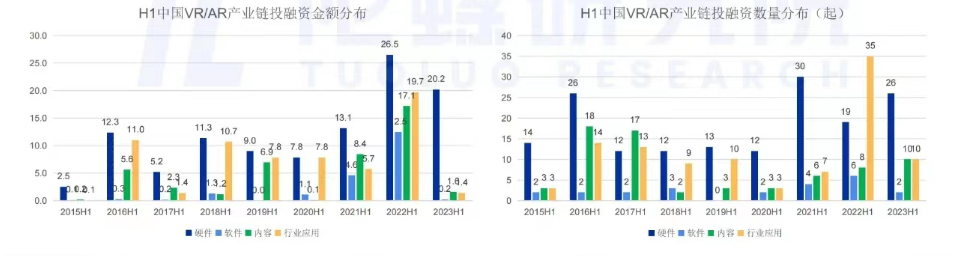 按产业链板块来看,国内2023年H1硬件是融资并购的重点板块,硬件板块融资数量为26起,同比增长36.8%;而软件、内容与行业应用板块融资额大幅下滑:上半年国内软件板块融资额为0.2亿元,同比下滑98.4%;内容板块融资额为1.6亿元,同比下滑90.6%;行业应用板块融资额为1.4亿元,同比下滑93%。