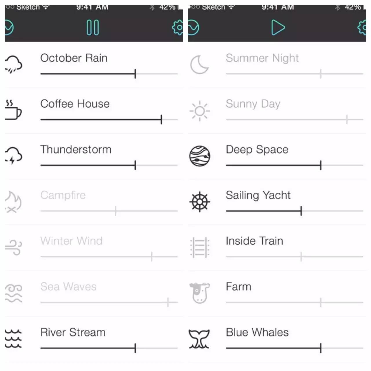 界面设计足够简洁的白噪音Noizio,可以调节每一项的音量,并存储混音。内置音效是不多,功能也不复杂。