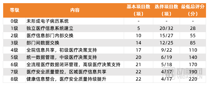 为了规范电子病历评级标准,推动医院积极参与评级,目前的电子病历系统应用水平被划分为9个等级,每一等级的标准包括电子病历各个局部系统的要求和对医疗机构整体电子病历系统的要求。