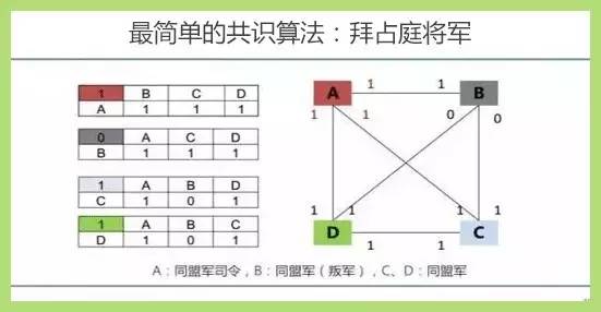我们看到图中表格,在收到的命令当中,C和D收到的是“101”,但是根据共识算法,他们在这之前约定,按“多数裁决”方式确定正确的命令,因此,C和D认为是攻城,是“1”。在这个例子中,尽管有B的故意捣乱,但A仍然可以和C、D一起联合行动,取得战争的胜利。