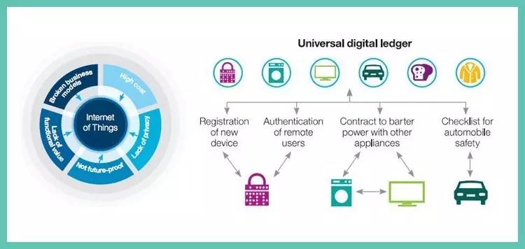 右图:区块链充当一个通用的数字账本,促进物联网设备间的不同类型交易