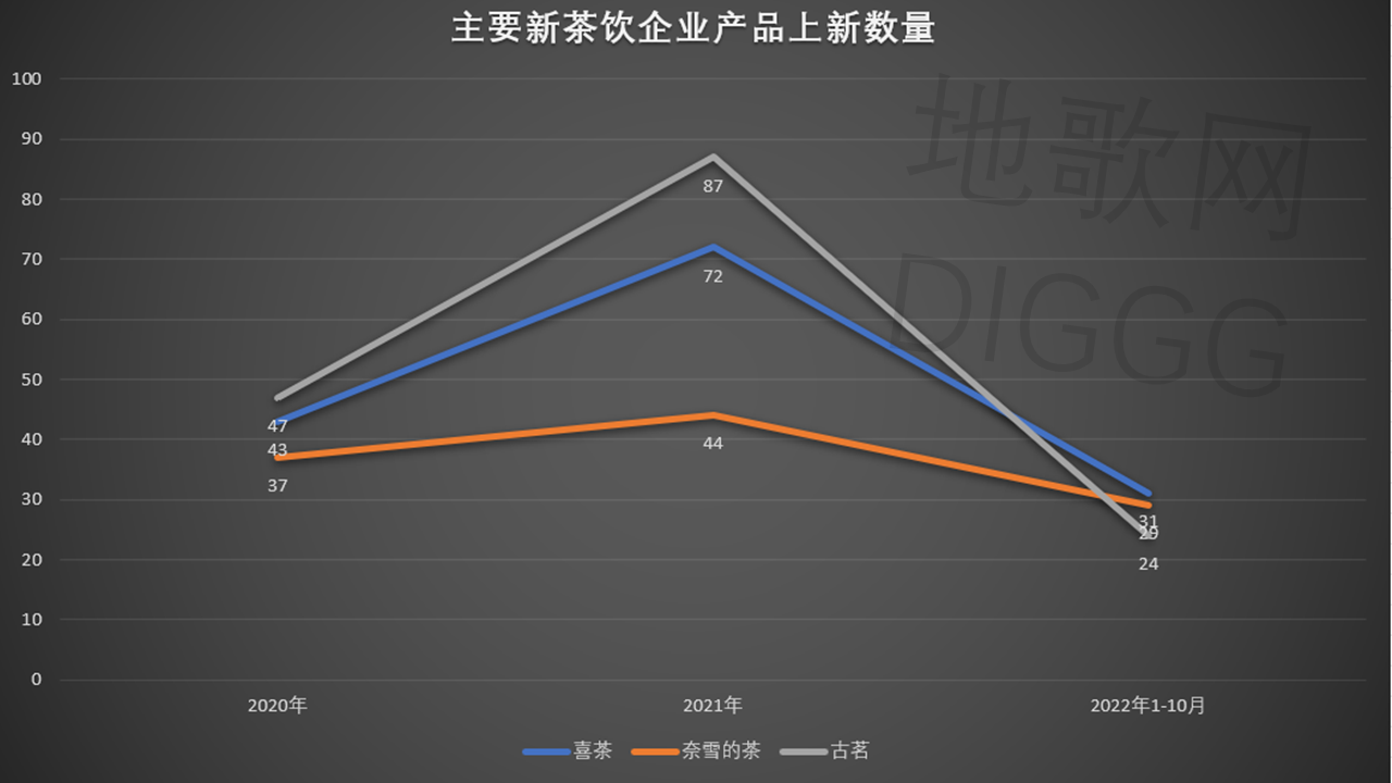 到2022年1-10月,喜茶、奈雪的茶、古茗分别仅上新31、29和24款新品,相比2021年均有下滑。