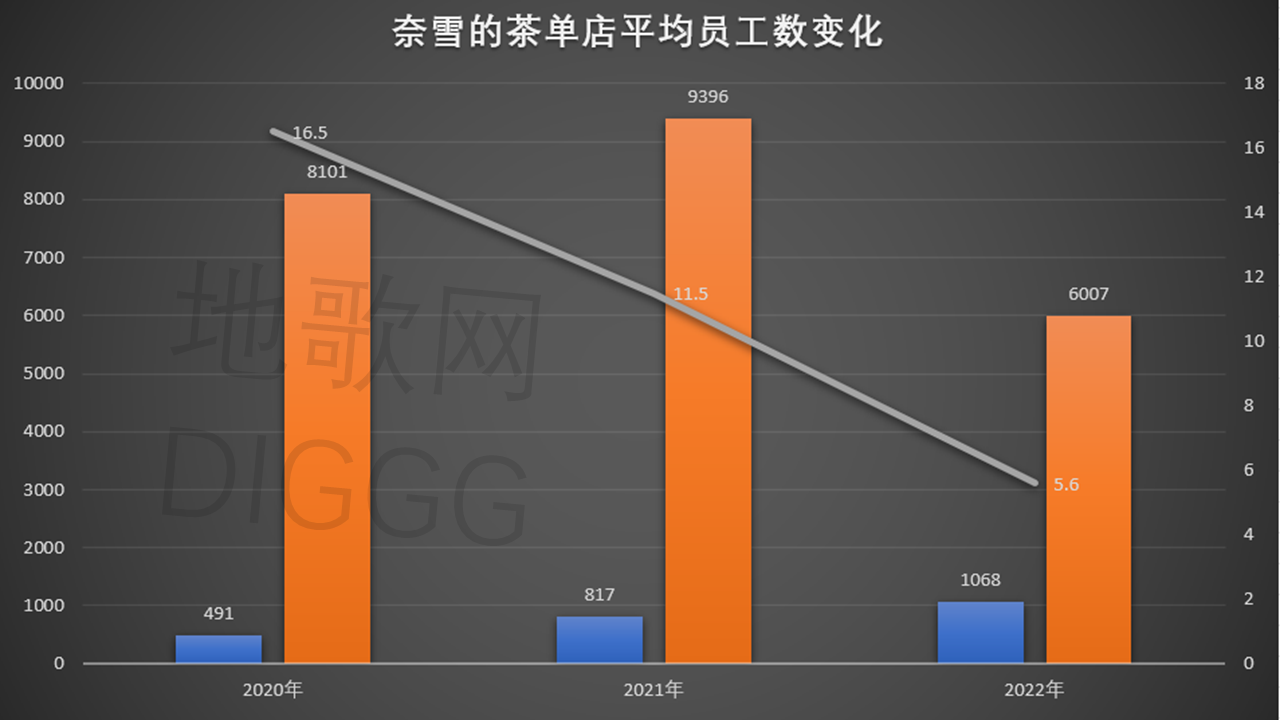 财报显示,2020年底,奈雪的茶门店平均员工数为16.5人;2022年底奈雪门店平均员工数降至5.6人。两年内门店数增长一倍,但门店平均员工数仅为之前的三分之一。