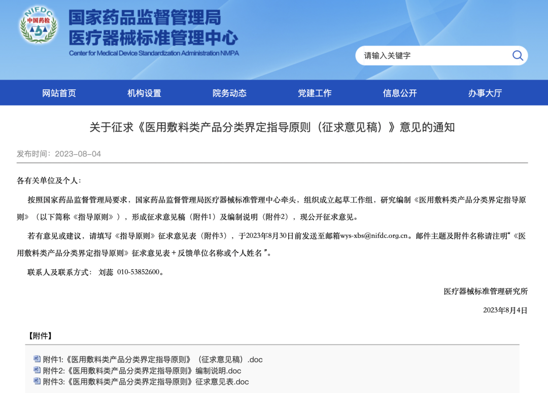 日前,国家药品监督管理局医疗器械标准管理中心发布关于征求《医用敷料类产品分类界定指导原则(征求意见稿)》(以下简称《指导原则》)意见的通知,明确了医用敷料范围、管理属性界定和管理类别界定标准。