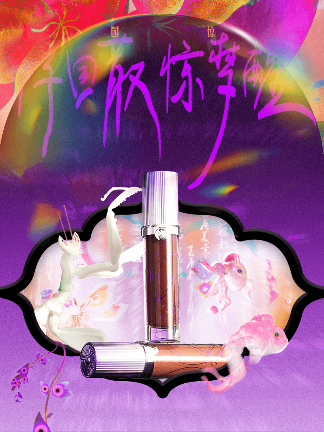 Girlcult从昆曲《牡丹亭》中提取灵感色彩,并结合多巴胺风潮,选取橘、紫高饱和色眼影呈现昆曲舞台上杜丽娘游园所见的绮丽景象。