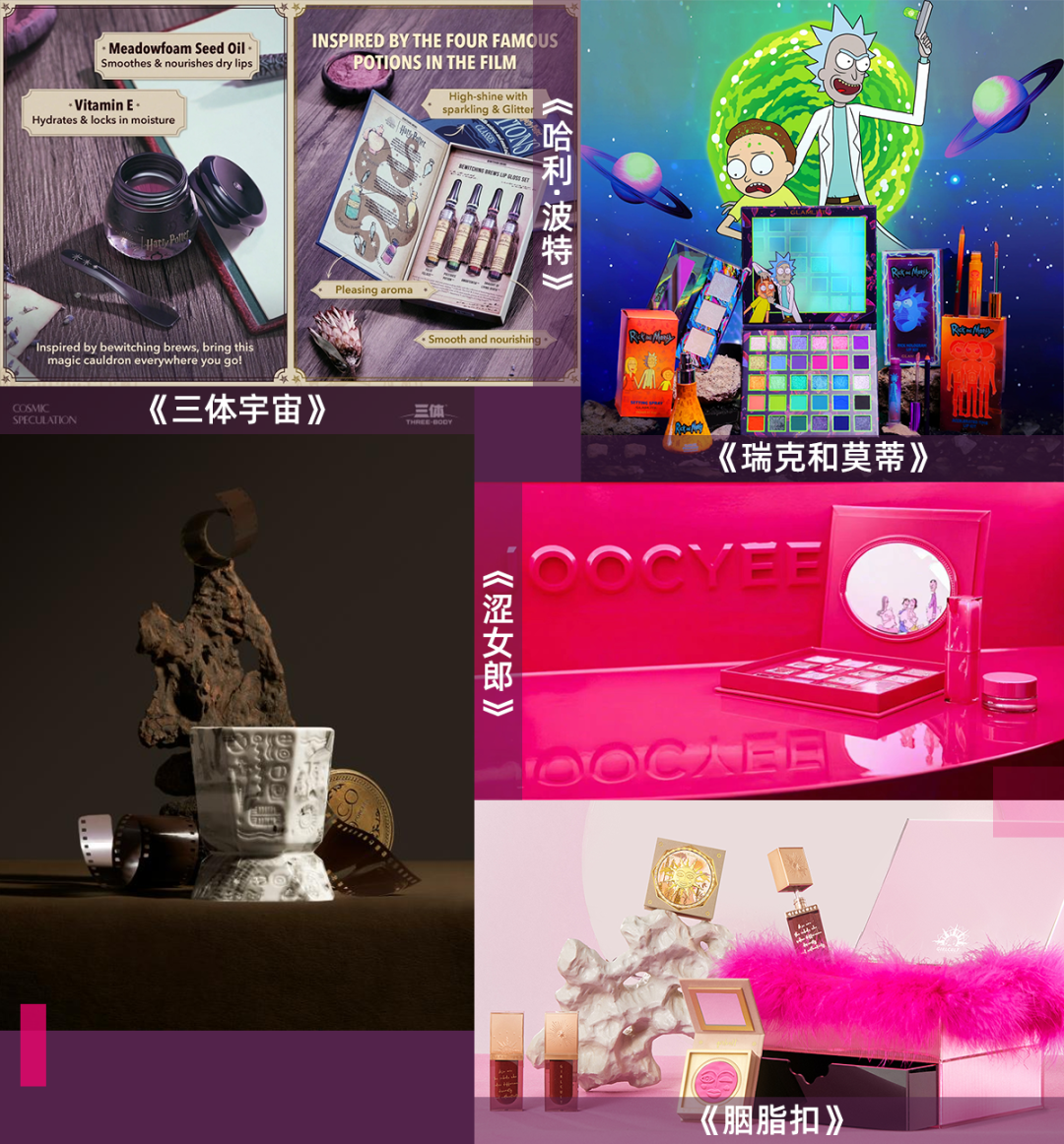 在美妆领域,小说和影视剧的IP联名是较为常见的。上半年的新品中, 彩妆品牌SHEGLAM联名哈利波特、彩妆品牌Glamlite推出《瑞克和莫蒂》联名、香氛品牌Cosmic Speculation宇宙的猜想推出三体宇宙联名、酵色推《涩女郎》联名新品、 Girlcult彩妆新系列致敬小说《胭脂扣》......等等,都是品牌携手经典知名IP共推新品,引起狂热小说迷和影迷的兴趣。