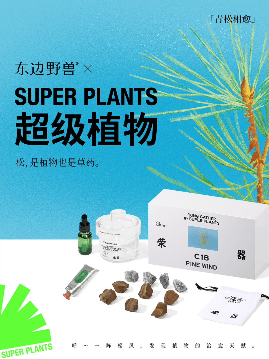 7月,东方草本护肤品牌东边野兽与植物创意工作室超级植物联名,以“松”为灵感,推出了青松相愈礼盒,旨在将远方的愉悦与灵感带给消费者。