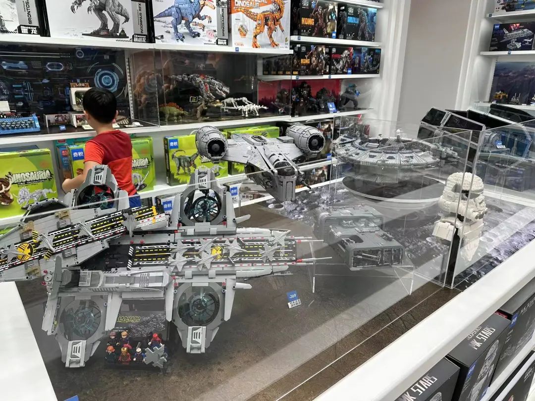 △ 商场中国产积木玩具,虽然也拿到了IP授权,却比乐高便宜得多。时代周报刘沐轩摄