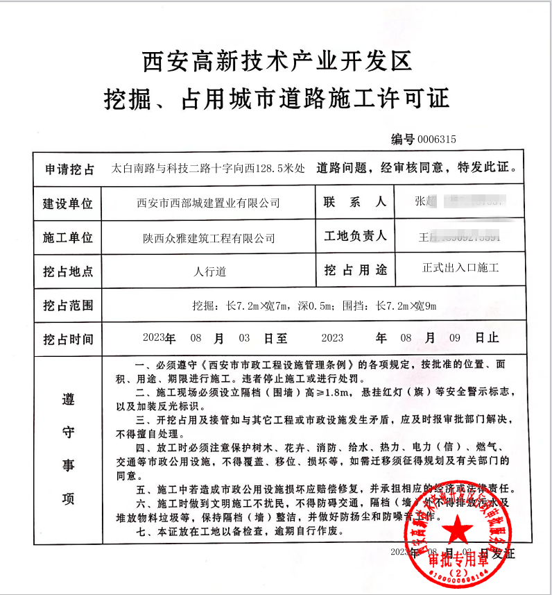 这是西安高新区发出的首张挖掘占道施工许可电子证照。今年以来,在西安市一体化政务服务能力提升专班、西安市工改办的支持指导下,西安高新区依托陕西政务服务网,实现了市政管线工程设计方案审查、挖占城市道路、临时占用城市绿地审批等外线工程并联审查,办事人员只需网上提交申请,相关审批部门将及时进行线上审批,审批通过后进入制证环节,最快2个工作日即可领取挖掘占道施工许可电子证照。