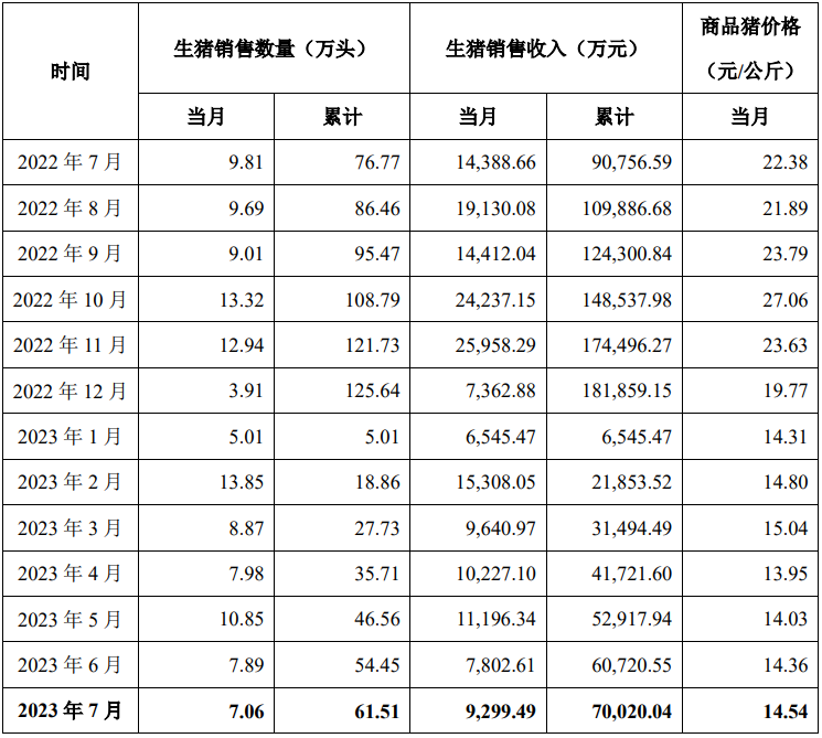 金新农8月8日公告,2023年7月生猪销量合计7.06万头,销售收入合计9299.49万元,同比减少35.37%;商品猪销售均价14.54元/公斤,环比上升1.27%。