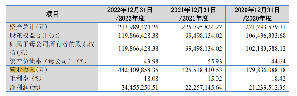 财务数据显示,2020~2022年(以下简称:报告期内),公司分别实现营业收入3.8亿元、4.26亿元、4.42亿元,归母净利润为2232.08万元、2235.8万元、3445.53万元,同比均呈增长态势,因此,业绩的快速增长,进一步展现了公司强大的研发生产能力,以及健全的品质管控体系和稳健的拓展渠道。