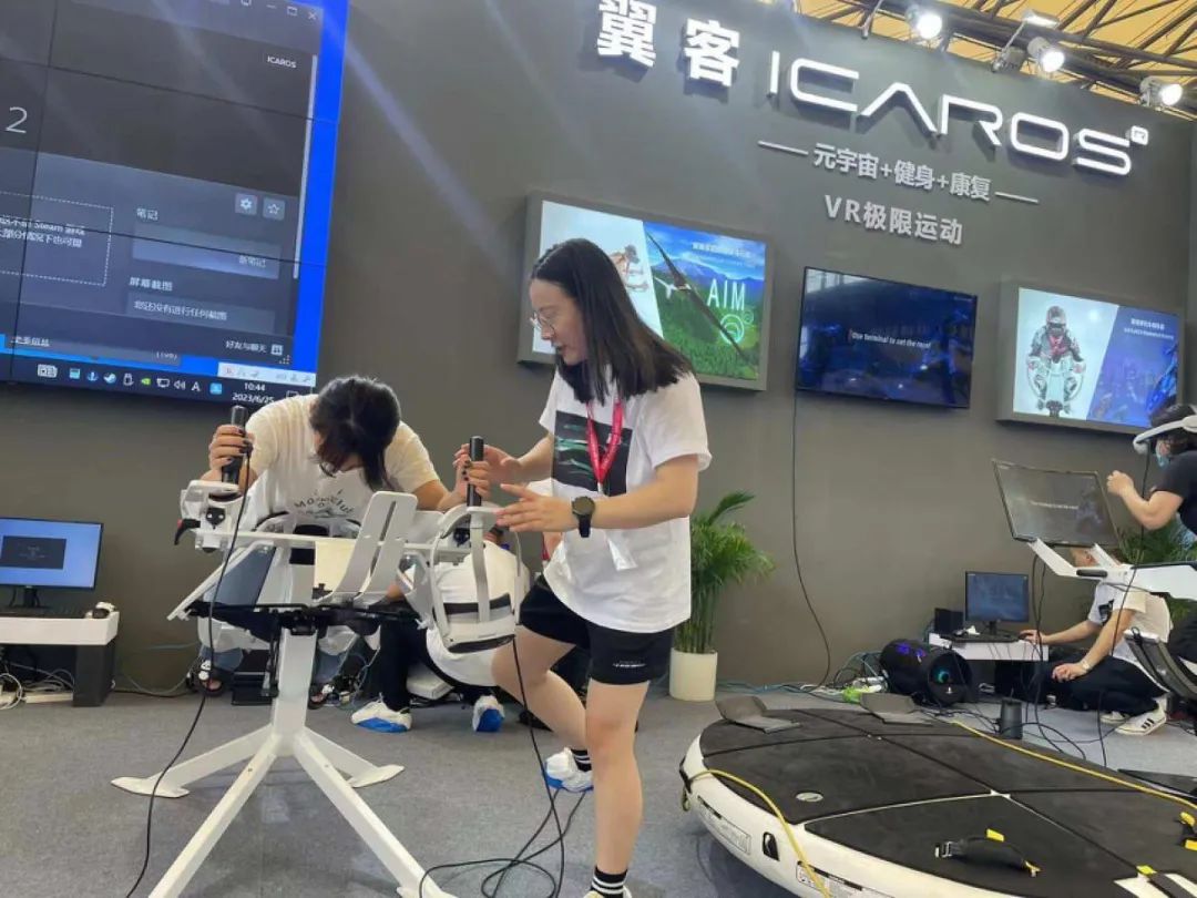 其中,德国品牌翼客(ICAROS)展示了自研的飞行器、VR摩托车健身、星球健身器等新型健身器材。据相关工作人员介绍,该公司成立的初衷就是打造属于新世代VR虚拟现实运动,打造元宇宙与体育相结合的全新健身方式。