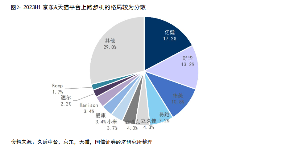 此外,国信证券针对上市健身器材企业德尔玛的分析报告可以看到,以销量最好的跑步机为例,目前行业格局散乱,还未形成明显的头部品牌。